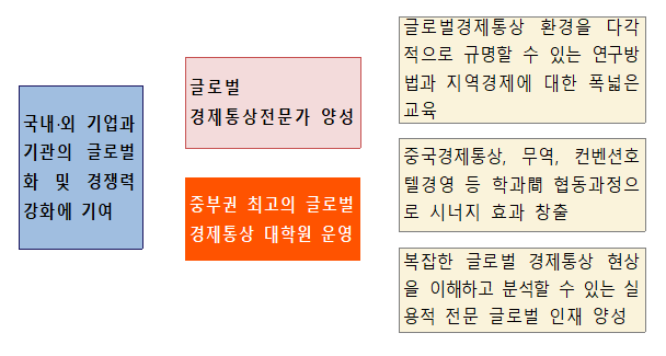 국제무역 및 금융의 제 현상을 다각적으로 규명할 수 있는 연구 방법과 해외지역 경제에 대한 폭넓은 교육을 실시하고, 글로벌경제 환경 변화에 탄력적으로 대응하기 위하여 학문체계의 현실성을 꾀하고 학문의 전문성과 문화적 다원성을 수용할 수 있도록 끊임없이 혁신하고자 한다. |